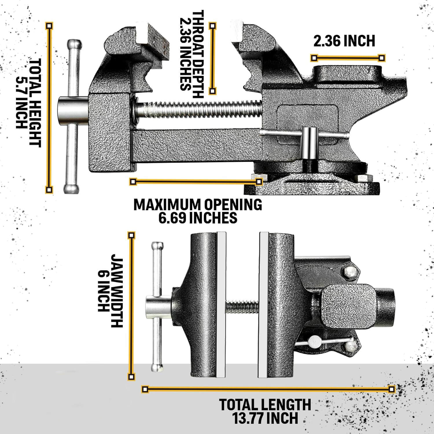 [Specifications] Accommodates a wide range of striking needs. Jaw width: 6"; Throat Depth: 2", Maximum opening of jaw: 4-3/10", Anvil:3.1''x2.9''. Creates up to 2200 lbs. of clamping force.