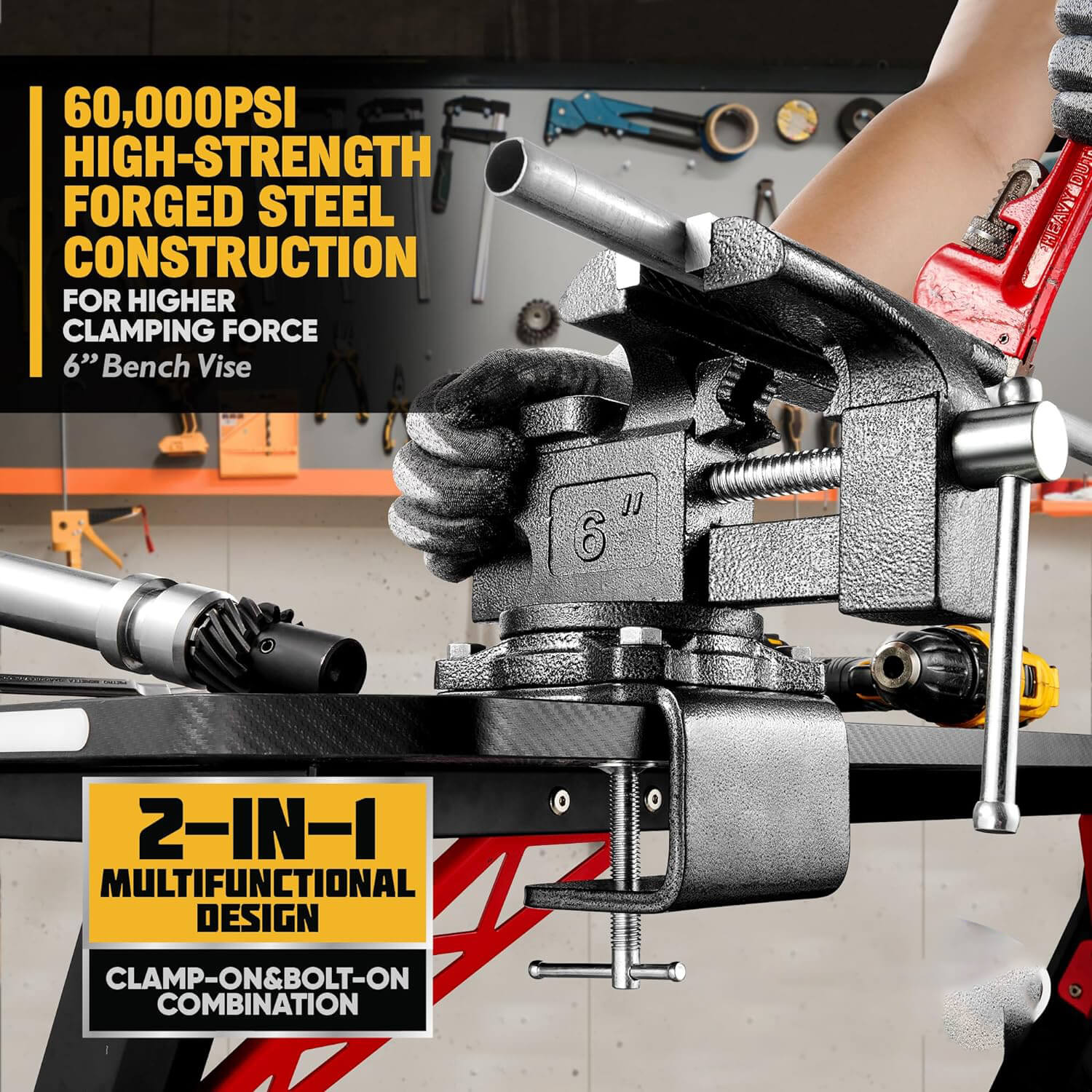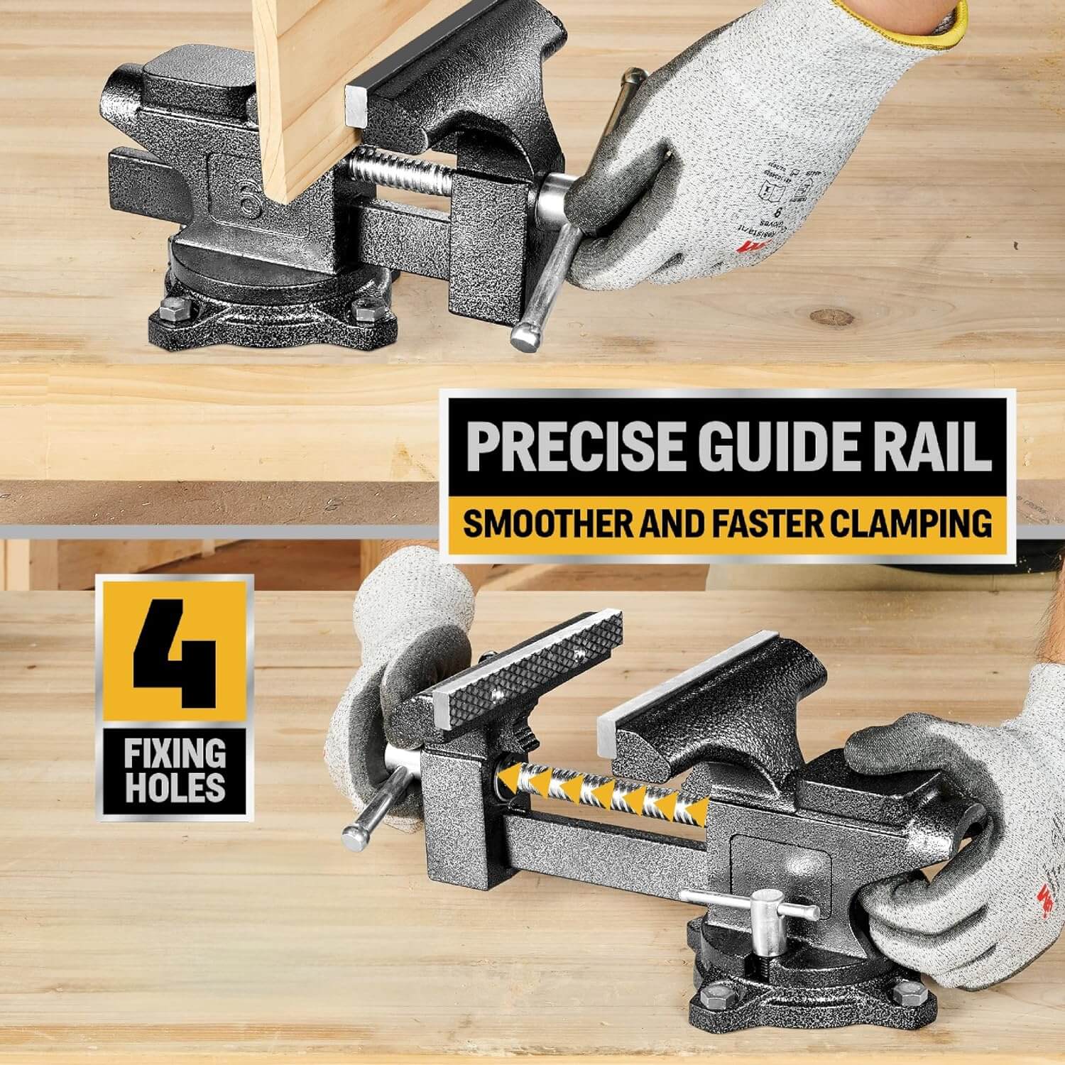 [Dual Purpose Bench Vise] The bench vice is removable, while a fixable option is also available. Comes with 4 bolts to securely fasten the vise to the workbench, improving the stability of the bench vice when working. Right out of the box.