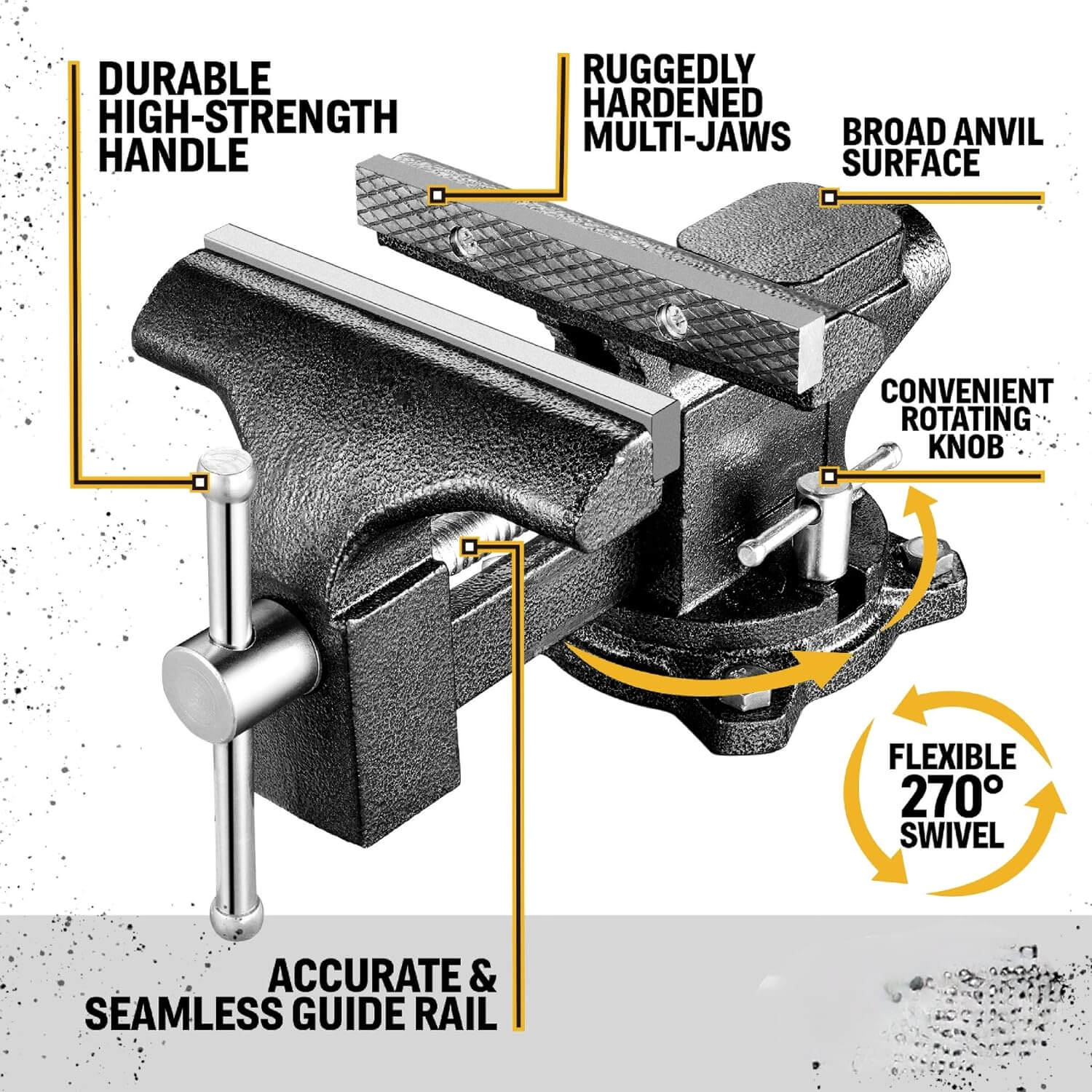 [270° Rotation Base] The swivel base of the vise with dual lock-down nuts can be rotated by 270 degrees for extra versatility, allowing for optimal work placement and flexibility. Polishing lead screw and guide rail are upgraded to achieve high precision and high hardness.