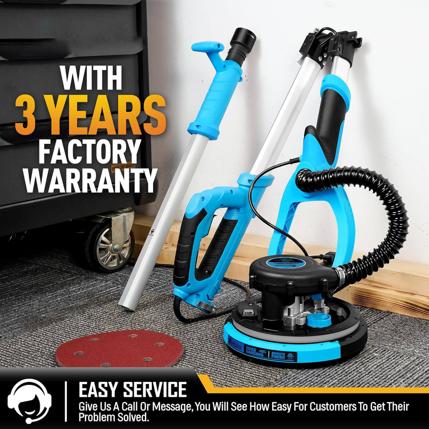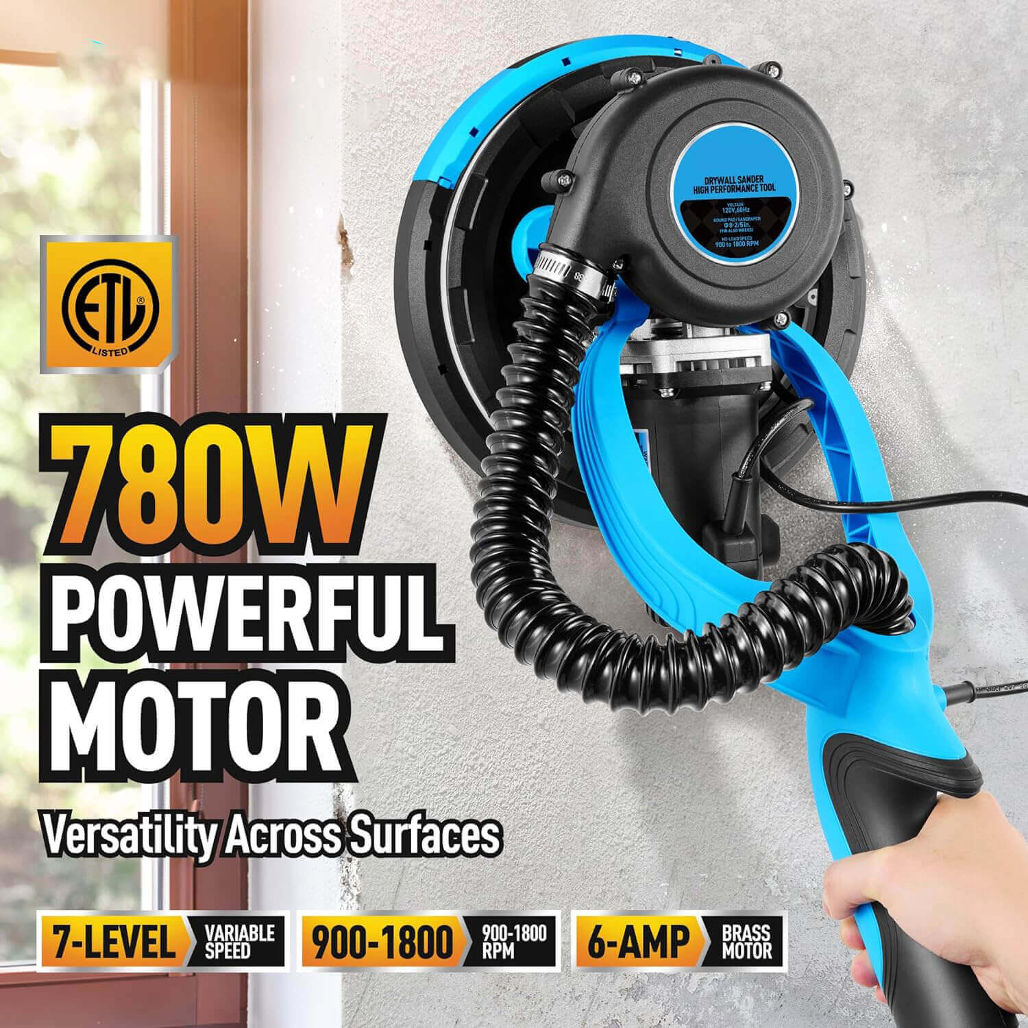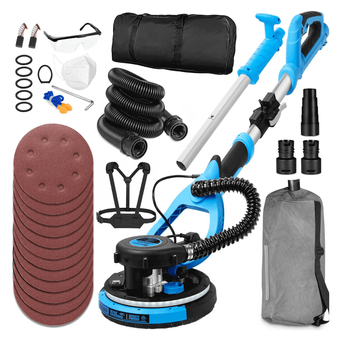 1 X Drywall Sander, 12 X Sandpapers, 1 X Dust Collection Bag, 1x Dust Extracting Hose, 1 X Carrying Bag, 1 X Hook-and-loop Fasteners, 1 X Labor-saving Back Belt, 1 X Hex Wrench, 1×screwdriver, 2 X Carbon Brushes, 1 X Set Of Safety Kit, 3 X Vacuum Hose Connectors, 1 X Manual.
