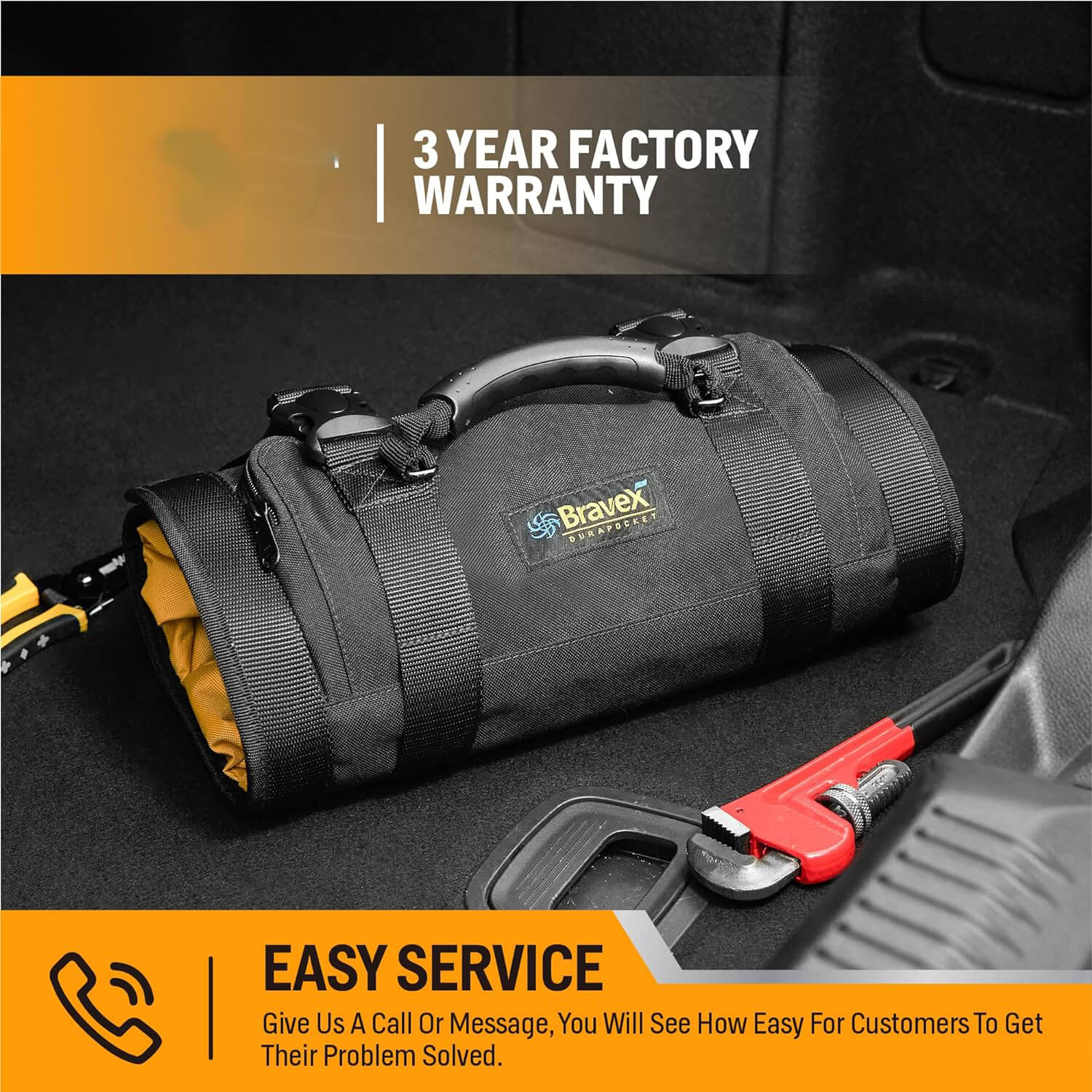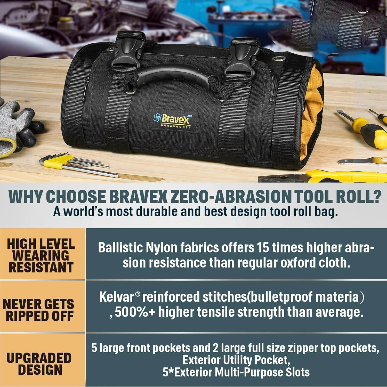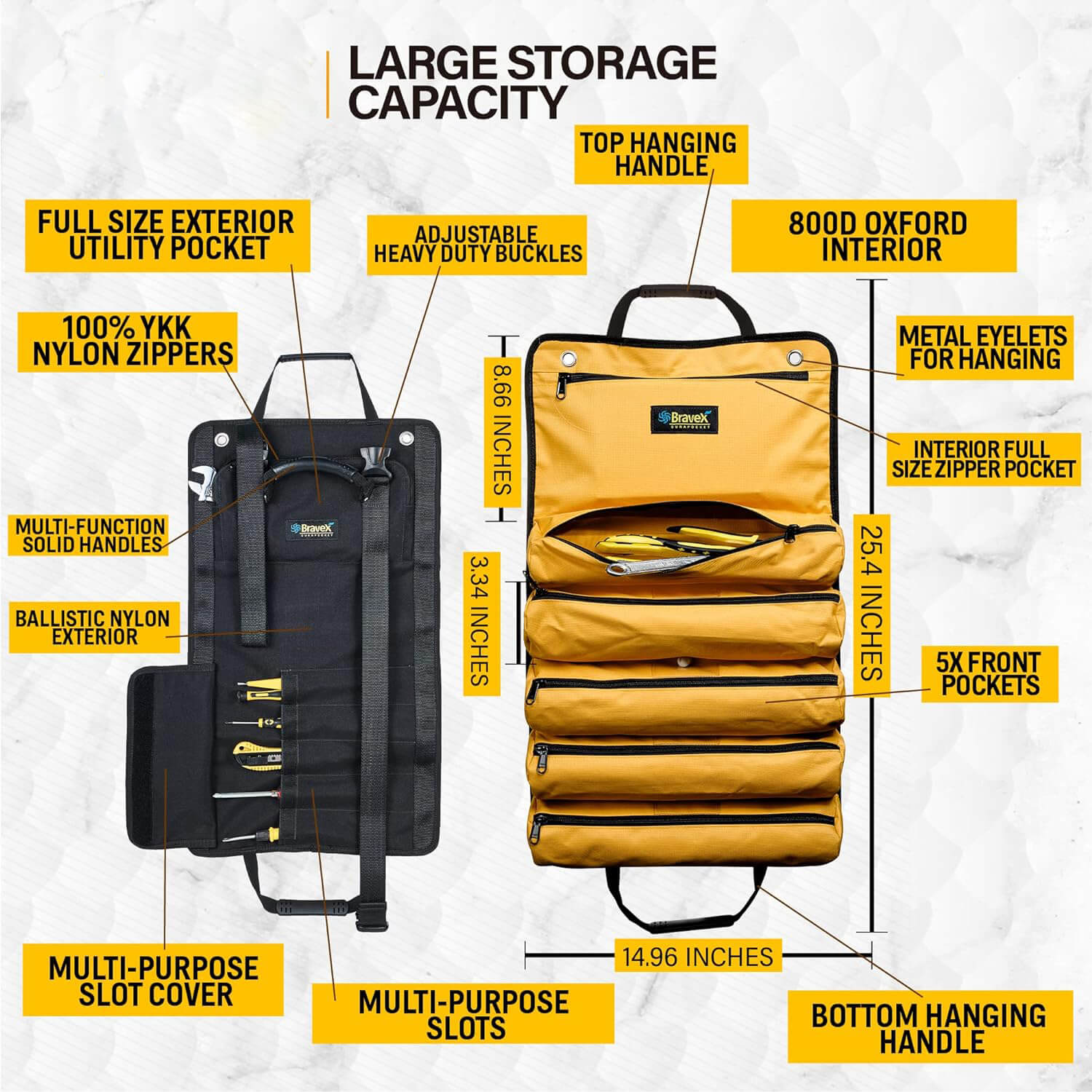 Rollo de herramientas resistente: la cubierta exterior está hecha de nailon balístico 1200D y tela Oxford 800D en el interior con una capa de PU impermeable; El hilo Kevin y la cremallera YKK brindan una alta resistencia al desgarro.