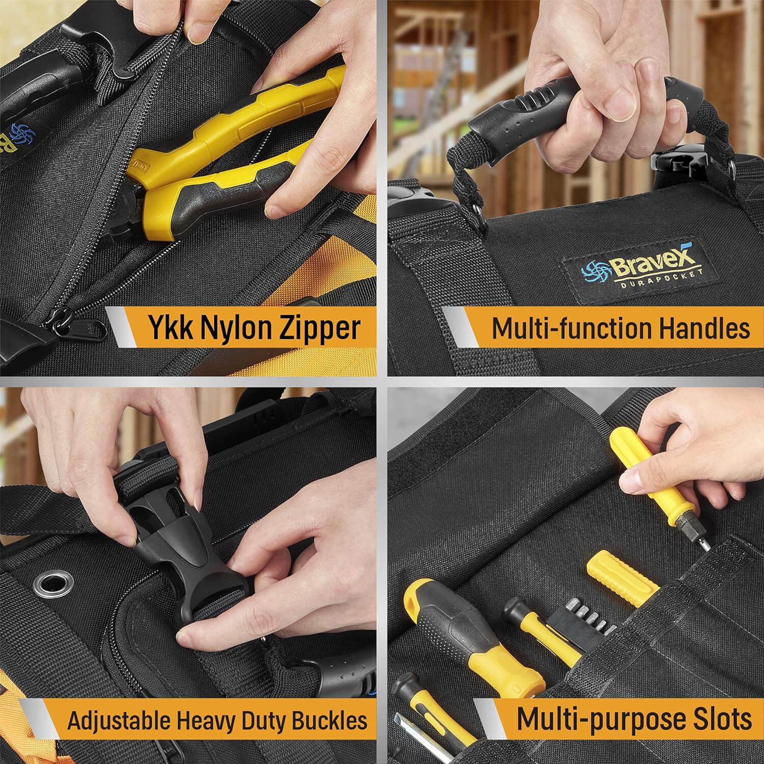 Fácil de transportar y usar: 3 manijas ampliadas y reforzadas lo hacen posible, las manijas de agarre suave hacen que transportar herramientas pesadas sea más fácil y cómodo. Se puede sujetar con la mano y colgar para facilitar el acceso en el automóvil, el taller, el garaje o el lugar de trabajo.