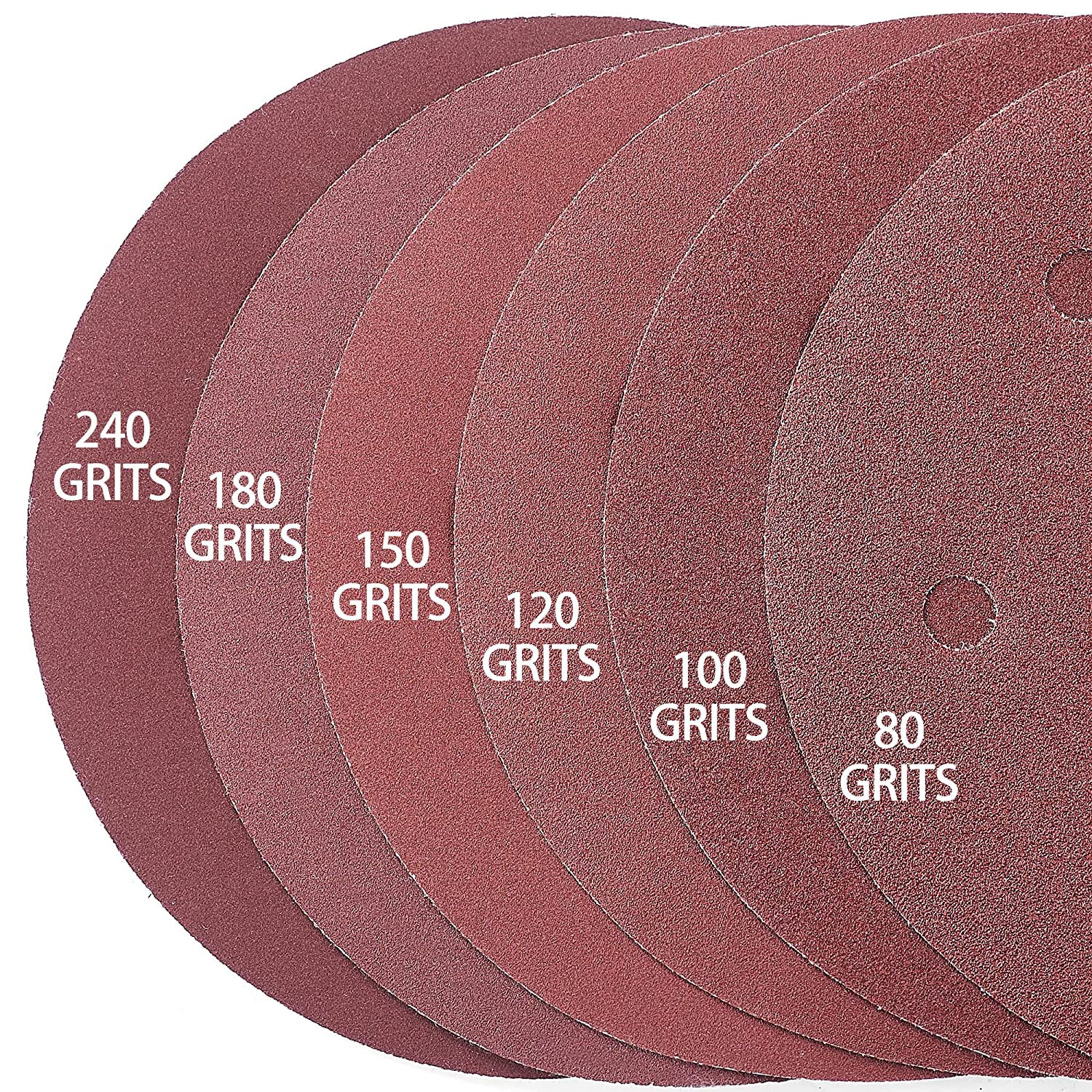 This product offers a set of 12 packs, with 2 packs each of sanding discs in 80, 100, 120, 150, 180, and 240 grits, featuring a 6-hole hook-and-loop design with a diameter of 9 inches.