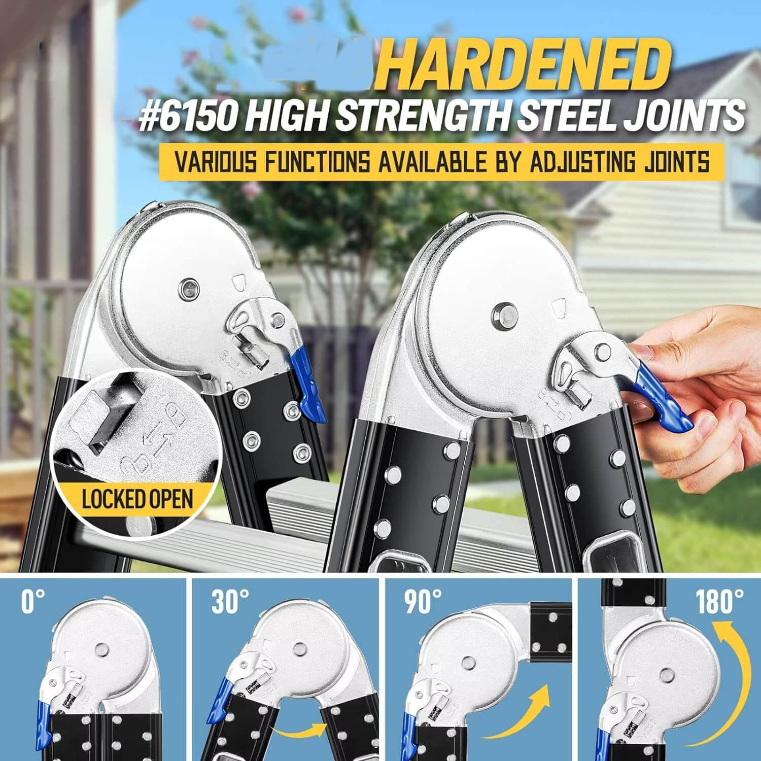 The Safety Joint Locks are made of 100% hardened high-strength steel, the size is larger than traditional ladder joints, and the load capacity and durability are three times higher than smaller joints. The JOINT LOCK design makes it convenient to fold and unfold the extension ladder. (Must be locked JOINT LOCKS at all times during use)