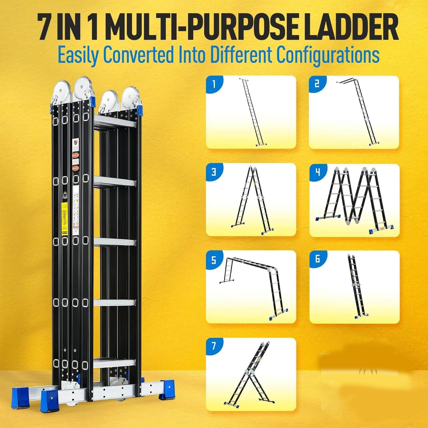 Multi-position ladder easily converts to an A-frame Ladder, Extension Ladder, 90° Ladder, Wall Ladder, and Scaffold to meet your different height requirements and working needs. (When using the scaffolding function, the support kit rack must be installed). The ladder can be extended to 19.6ft and easily reach up the roof. It’s only 4.9ft tall when fully folded, convenient to store and carry.