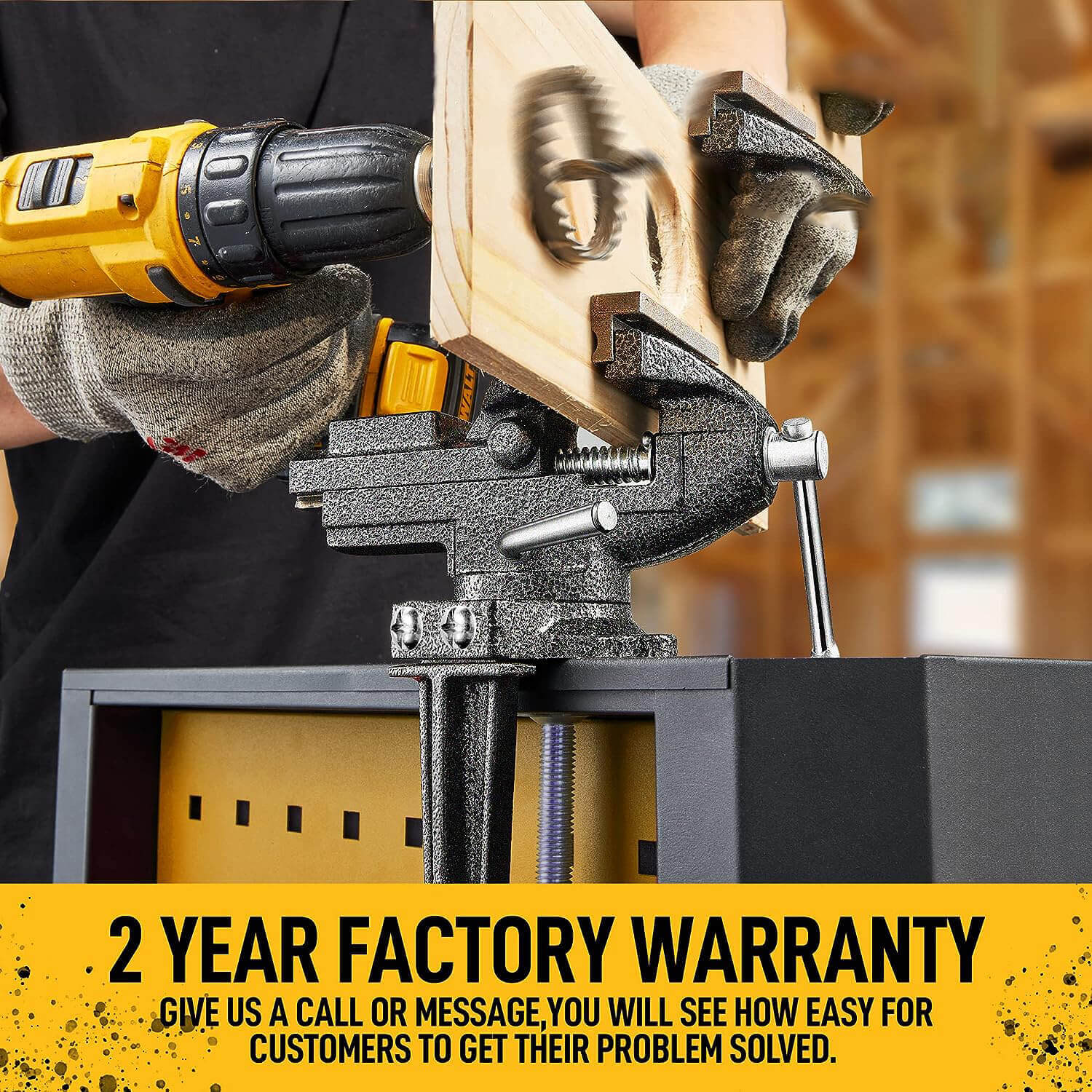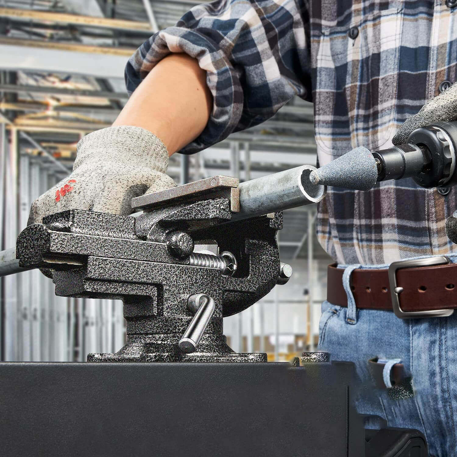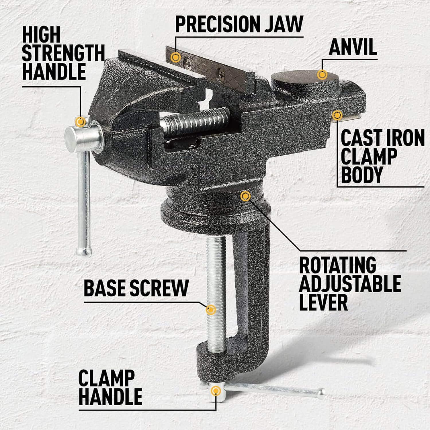 360° Rotation. Built-in 360-degree swivel base, the workbench vise is perfect for various clamping angles for flexibility. Smooth guide rail makes the screw and handle use smoothly and effortlessly.
