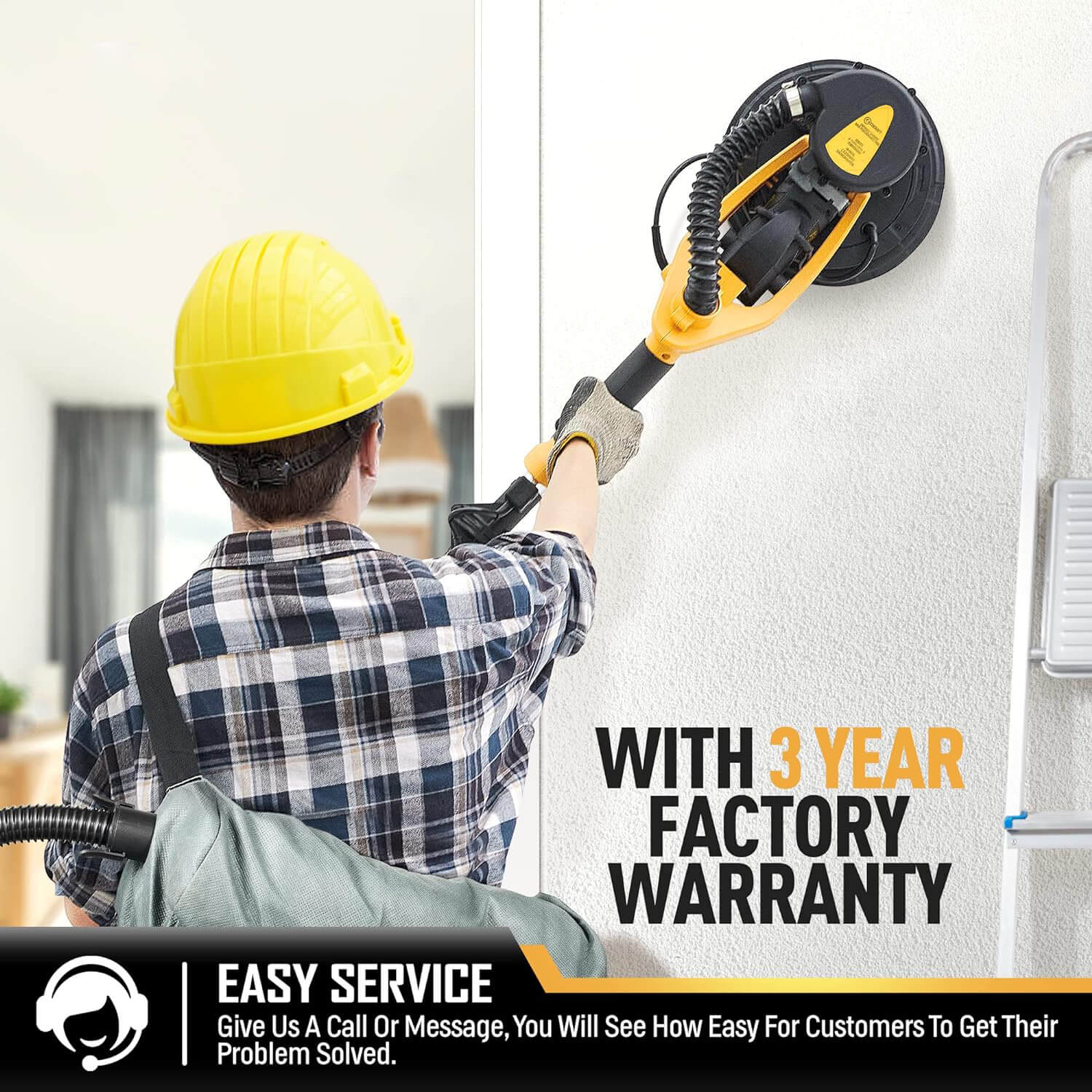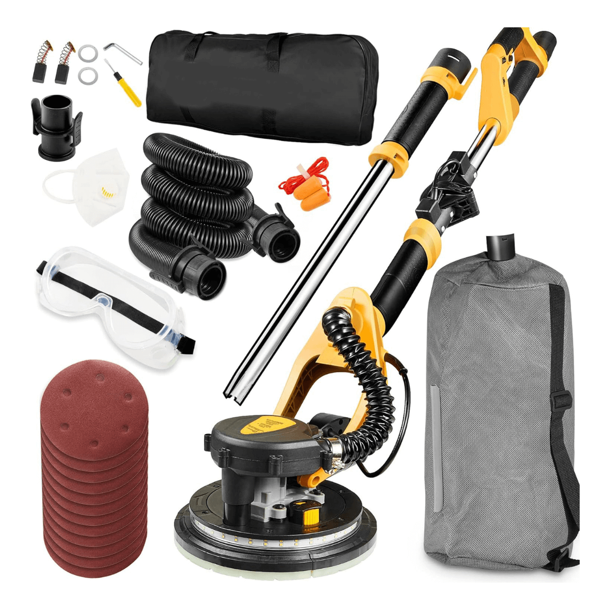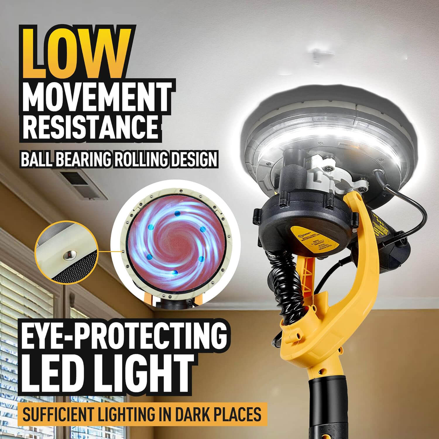 Designed for sanding drywall or plaster walls and ceilings in any position. Built-in extension changes the length of the tool from 4.6ft to 6.3ft., allowing you to reach up to 12ft. Lighting System helps you see all the variations on the surface you are sanding.