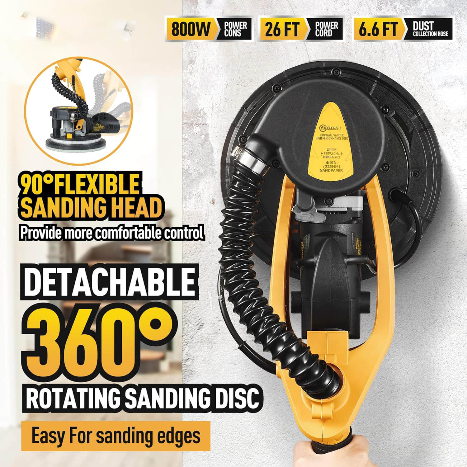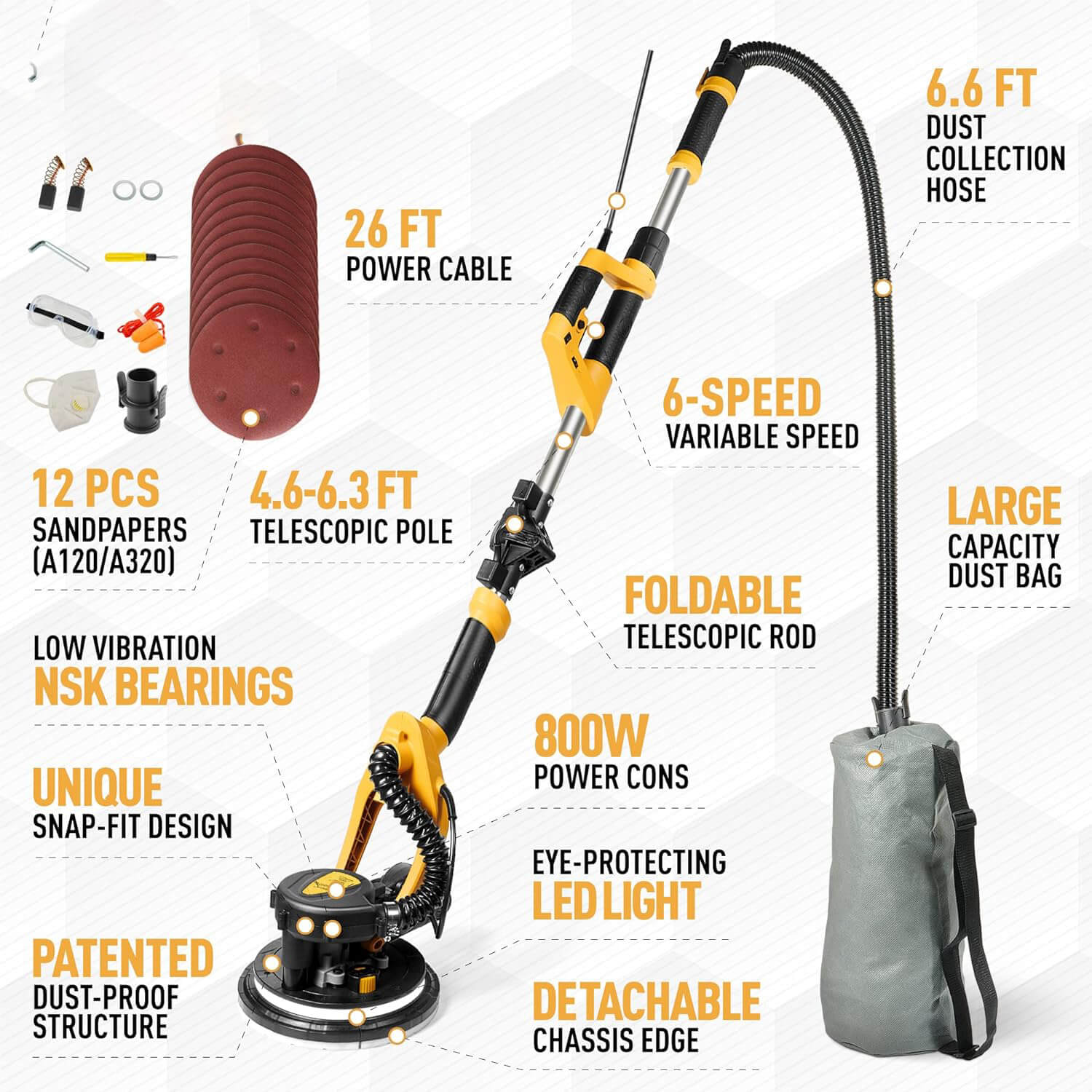 Drywall Sander, 800W Powerful Electric Drywall Sander with Vacuum, 99% Dust Absorption Dust-free Design, 6 Variable Speed 500-1800RPM, 26' Power Cord, LED Light, for Popcorn Ceiling, Wood Floor etc