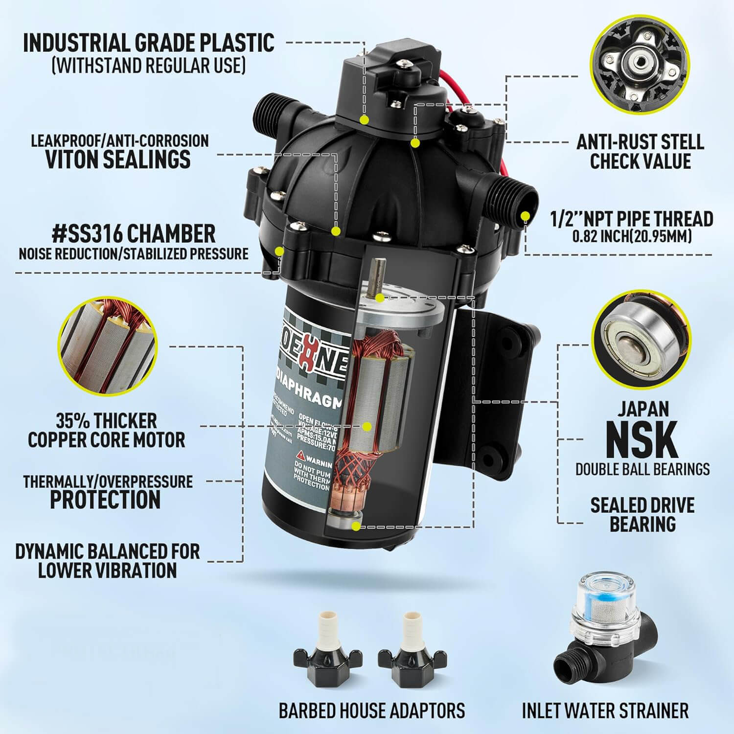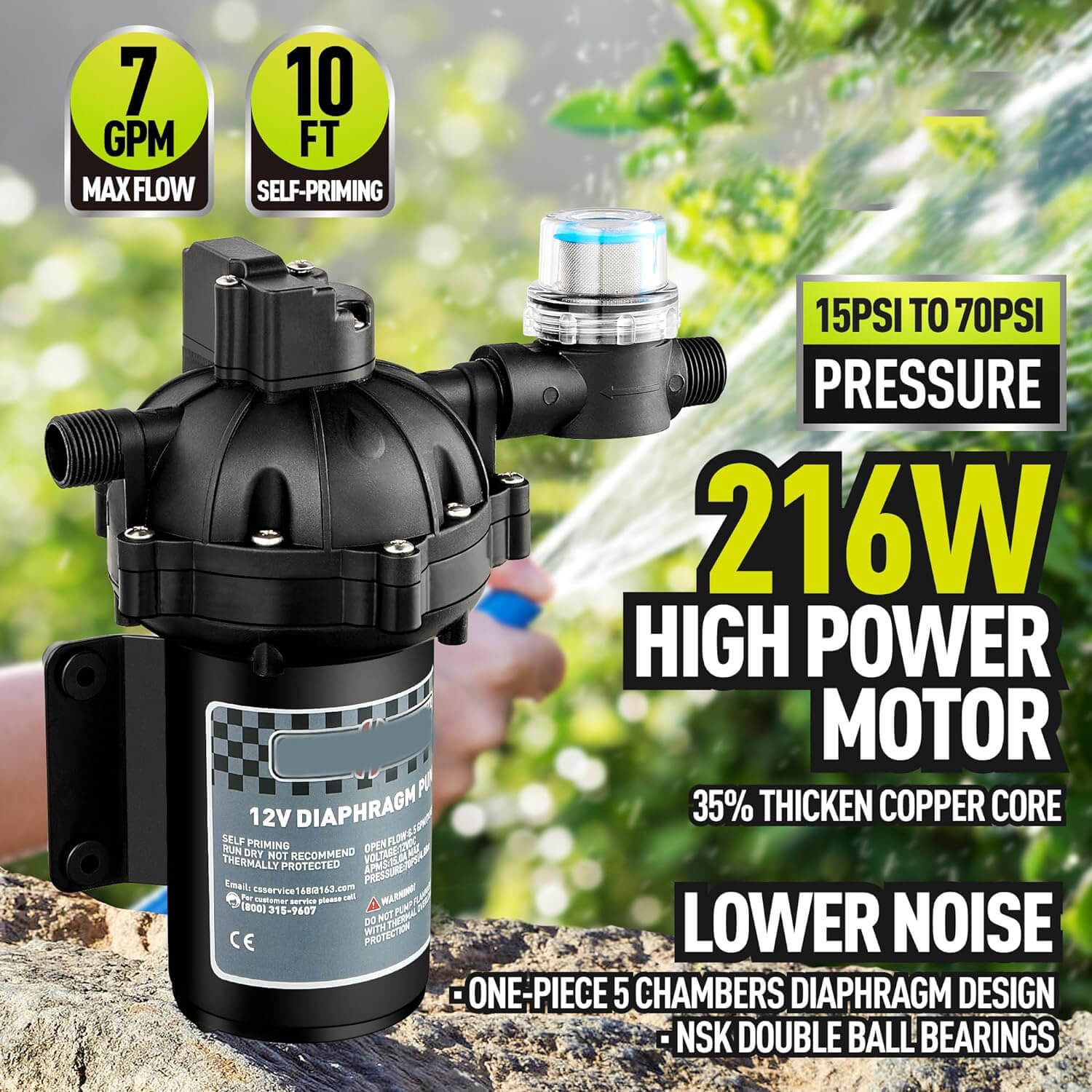 [Upgraded Version] RV Fresh Water Pump, 12V DC Water Pump, 7GPM 70PSI Five Chamber Self-Priming Diaphragm Water Pump with Heavy Duty Pressure Switch and Strainer for RV, Marine, Yacht, Caravan