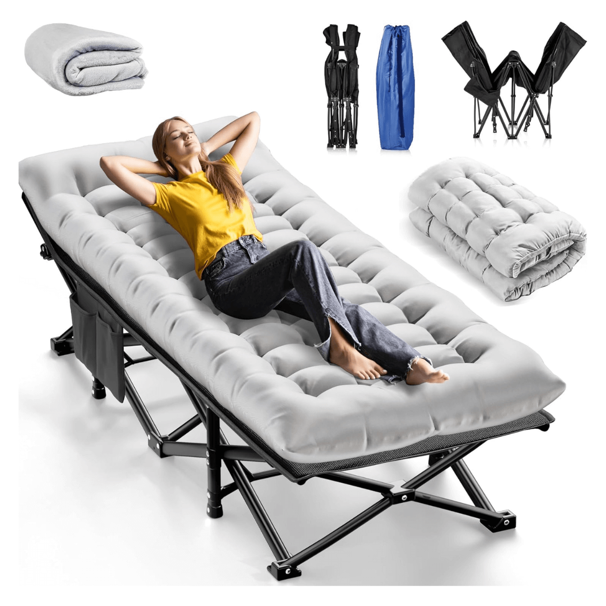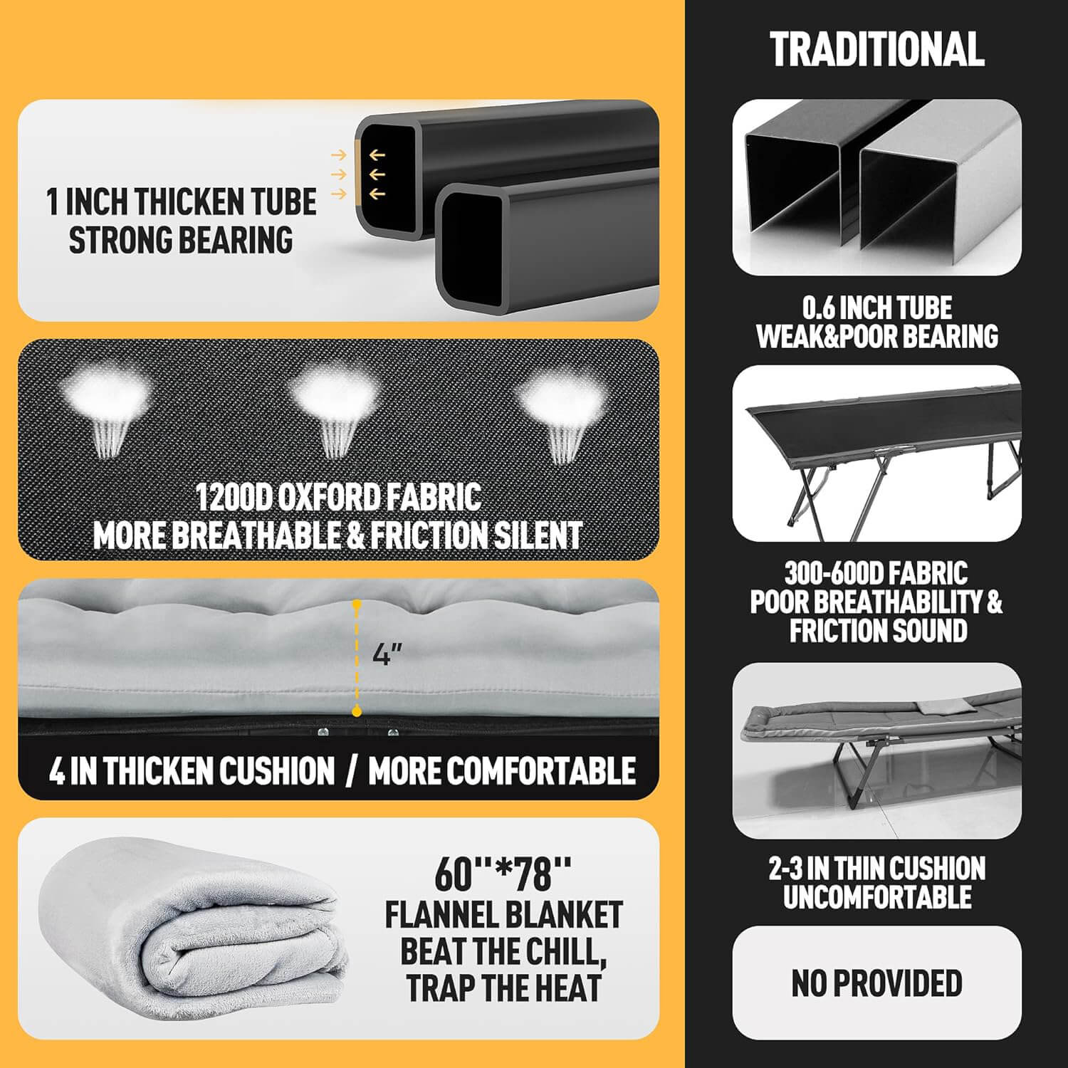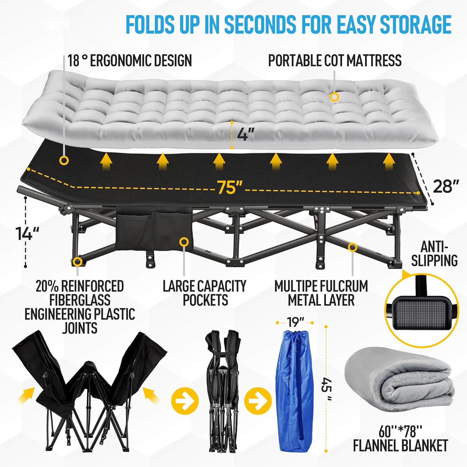 Camping Cots for Adults, Upgraded Folding Camping Cot Heavy Duty Sleeping Cots Bed 1200D Double Layer Oxford Camping Cot Mattress with Flannel Blanket for Home Office Nap Beach Travel, 550LBS