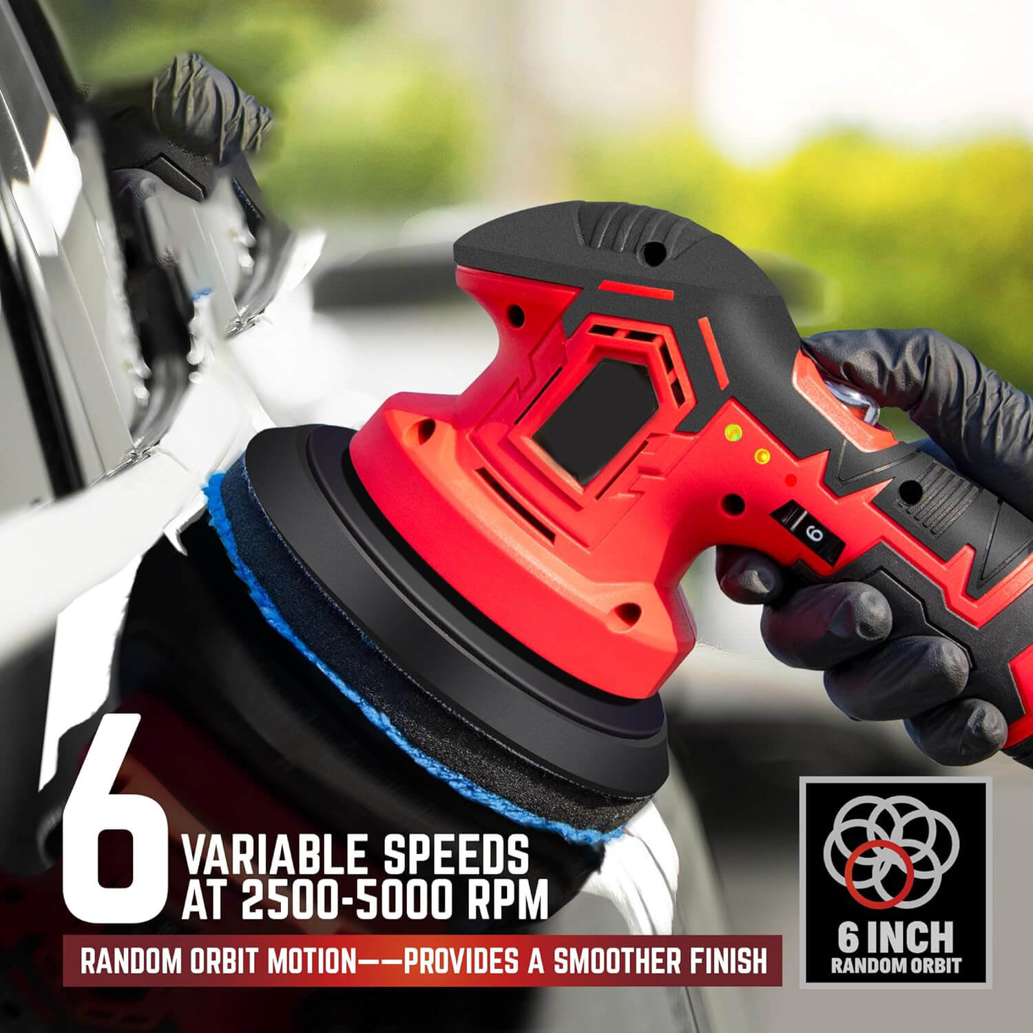 The buffer polisher enjoys versatility with the 6-level variable speed, ranging from 2500 to 5000 rpm. Adjust the speed according to your specific work requirements. The 6-inch cordless polisher waxer for car detailing effortlessly glides on any surface, leaving it not only clean but also brilliantly shiny.