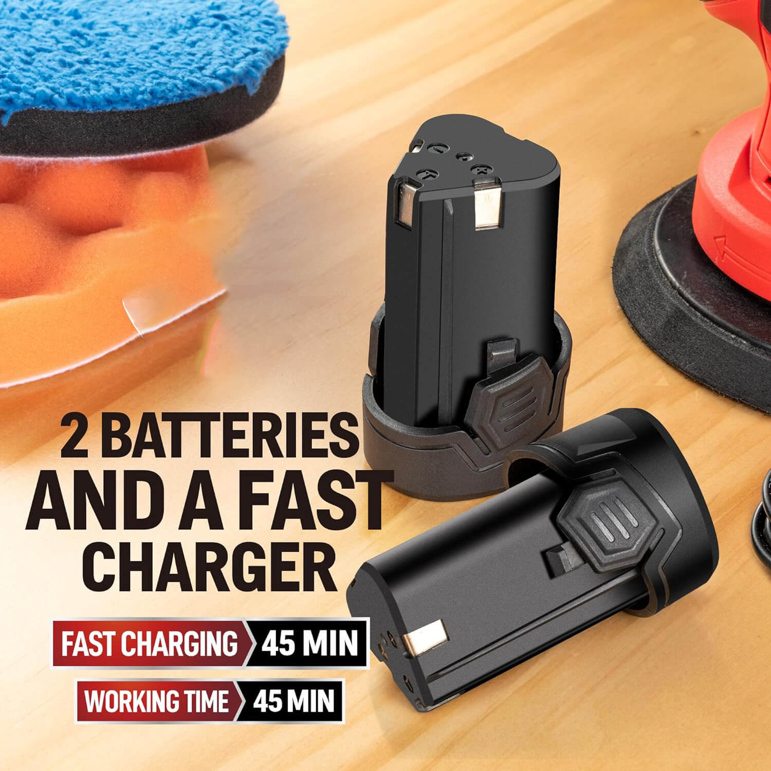The polisher for car detailing comes with two 12V 2.0Ah rechargeable batteries and a charger, ensuring long-term and alternating use. The cordless polisher features a built-in battery indicator that turns red when it requires charging. Just 35 minutes of charging provides up to 45 minutes of battery life.