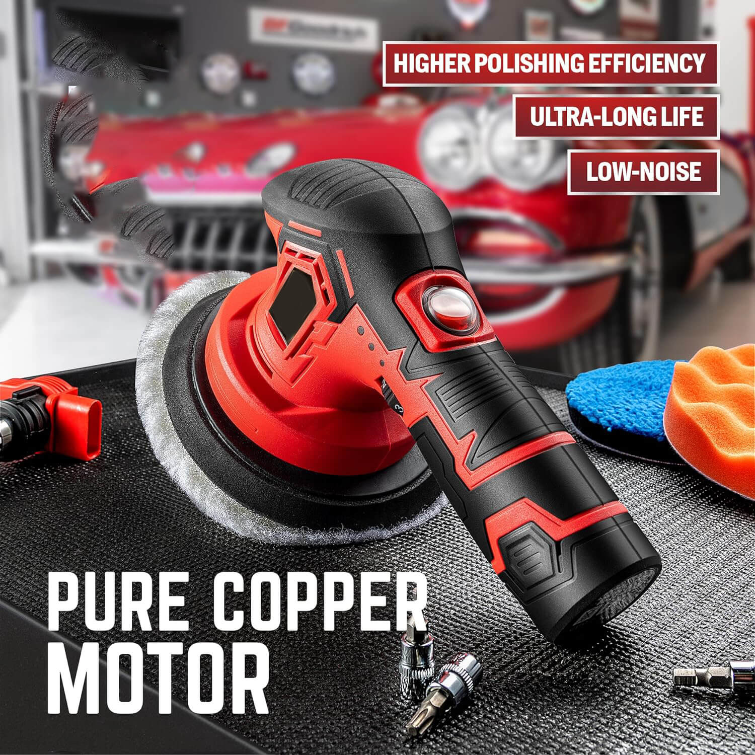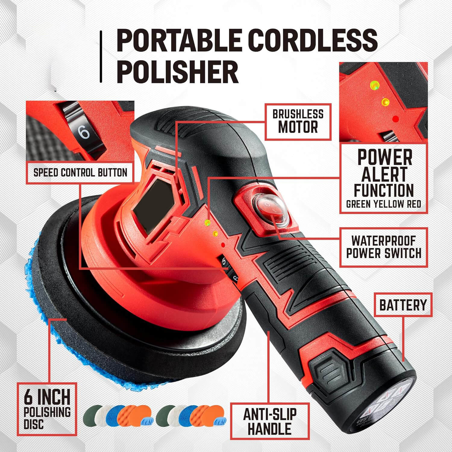With the buffer polisher cordless design, the car buffer can easily reach every corner without the hassle of cords or limited mobility. Weighing only 2.5 lbs, the car polisher provides convenient operation. The waterproof power switch eliminates concerns about electricity and water hazards.