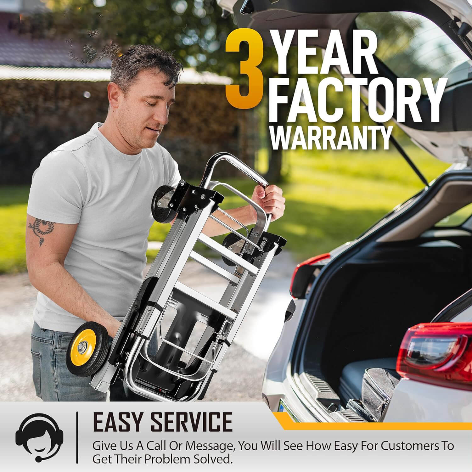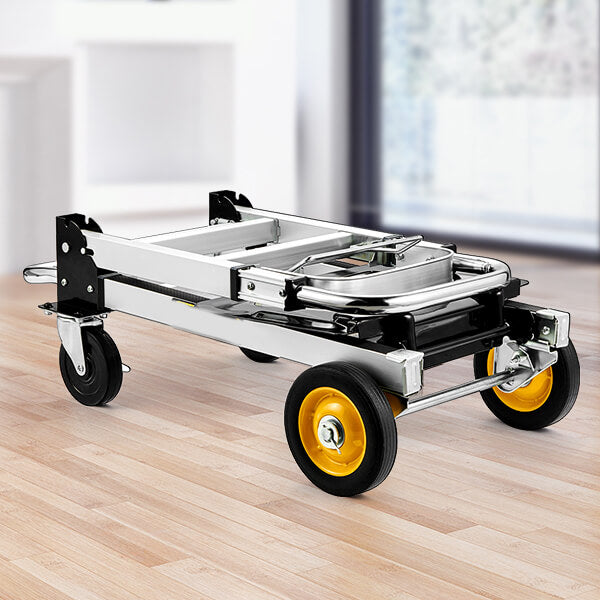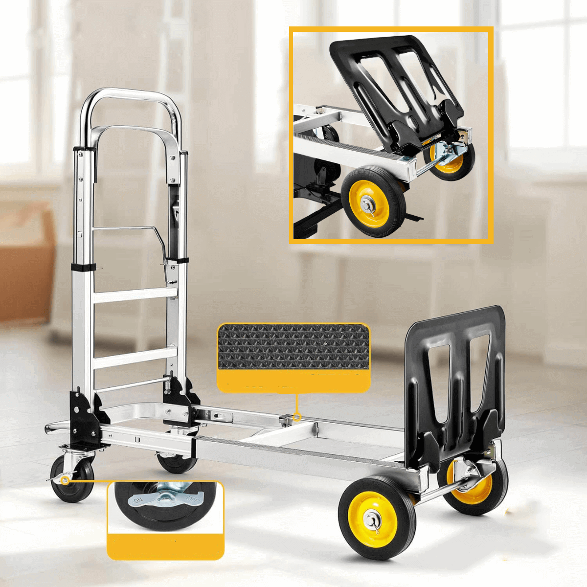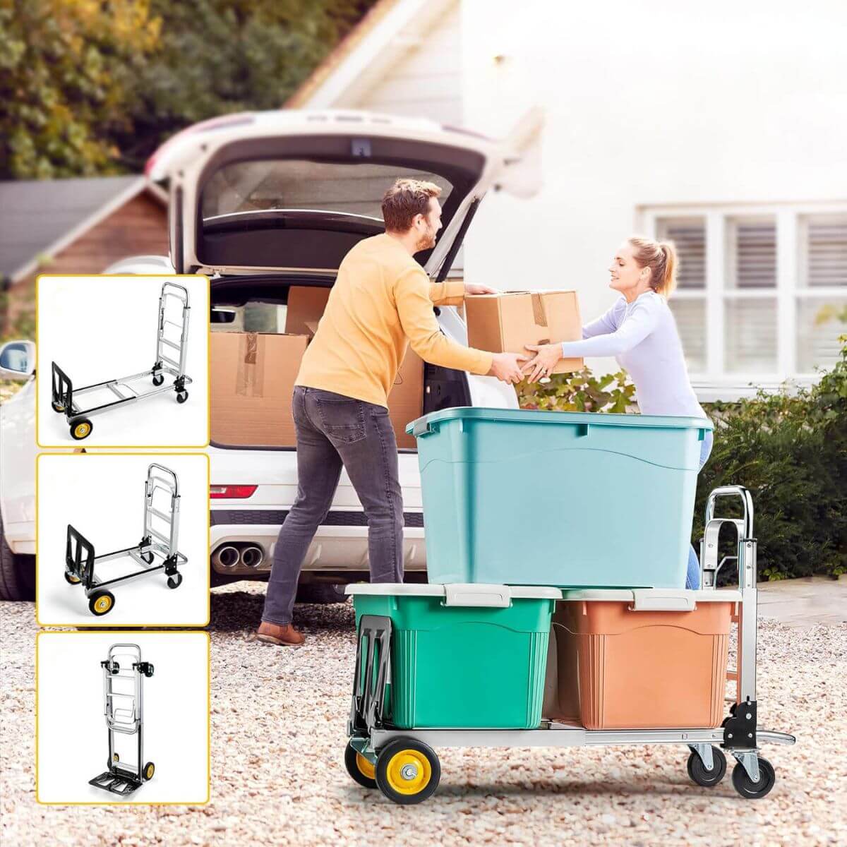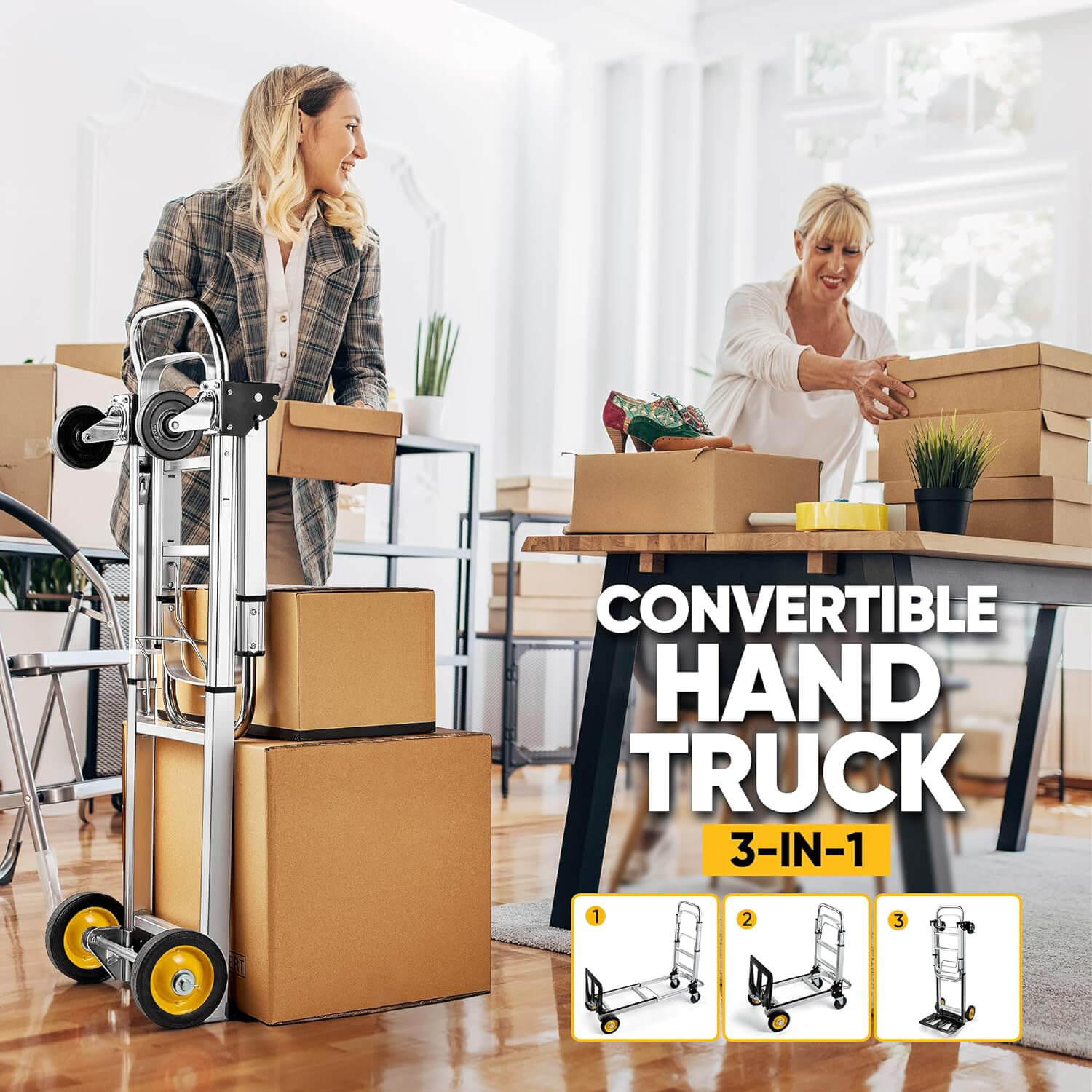 Convertible Purpose. It can be quickly switched as a 2-wheel Upright Hand Truck for 220 lb or a 4-wheel Platform Cart for 440lb loading capacity without tools. That is great to own a regular dolly or heavy-duty hand truck.