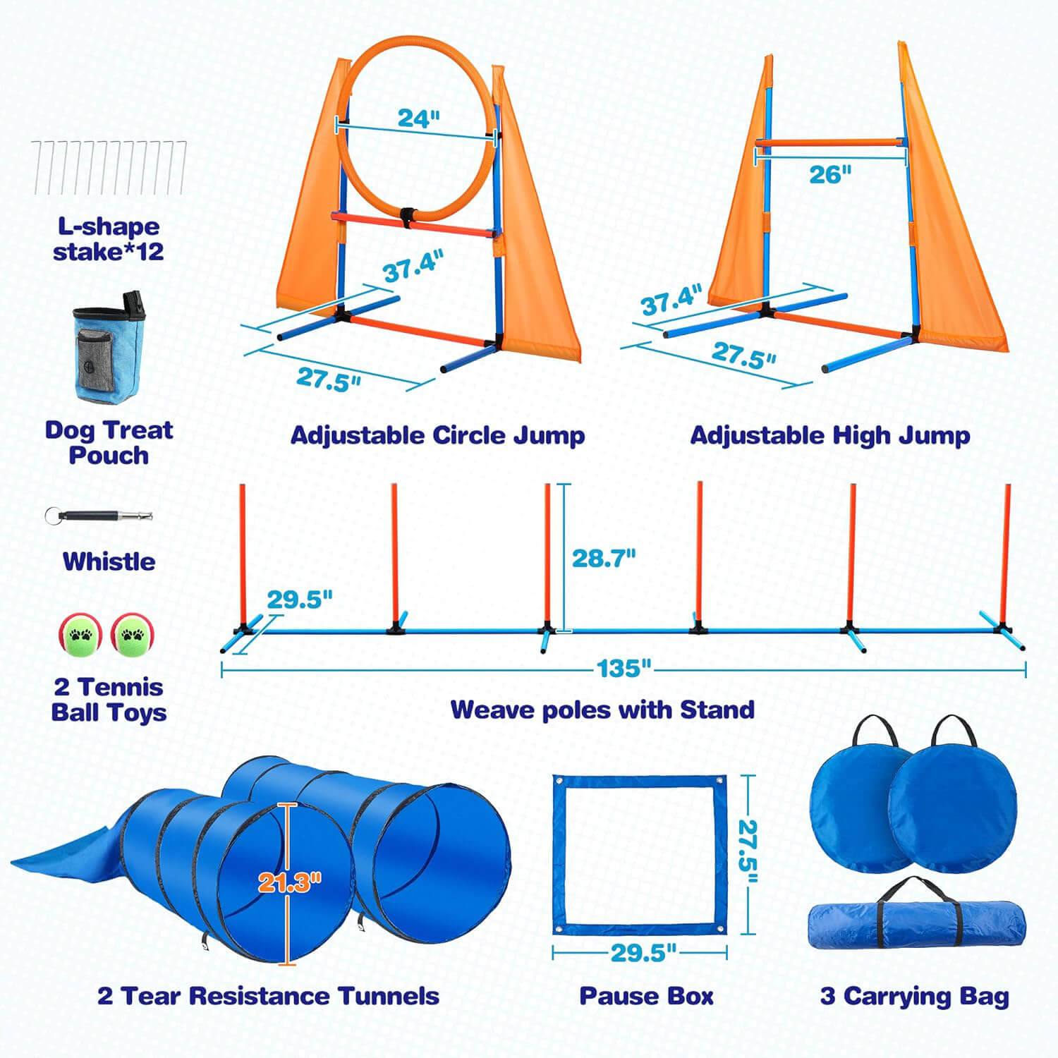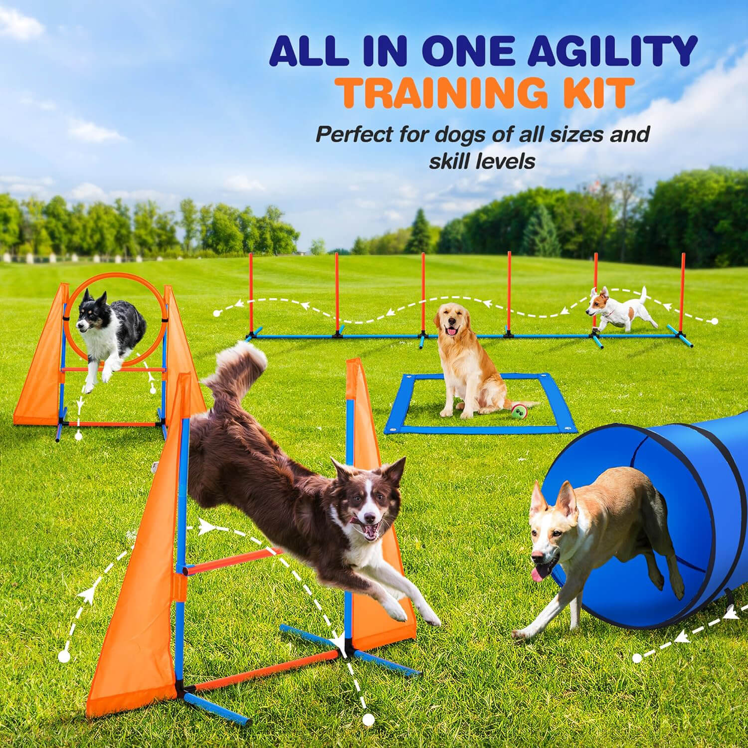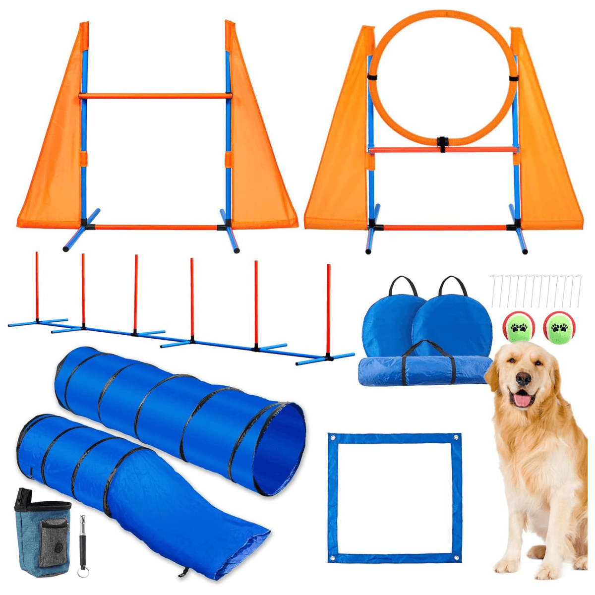 Dog Agility Course Backyard Set, Portable Agility Training Equipment for Dogs - 2 Agility Tunnel, 2 Jumps, 6 Weave Poles, Pause Box & More, Dog Obstacle Course Kit for Indoor and Outdoor