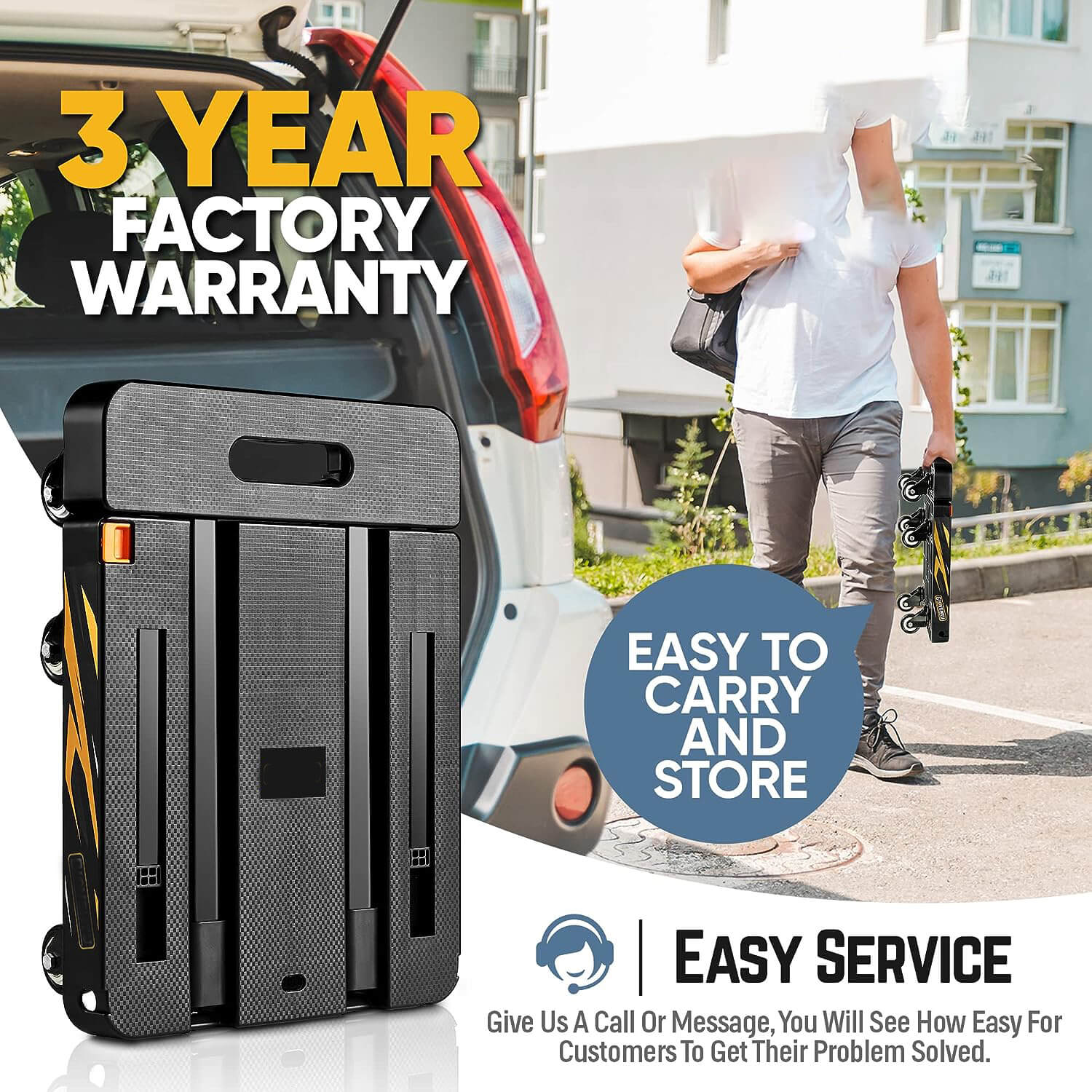 60s Quick Installation: Unique slot design allows you to install wheels within 60 seconds without any tools(50% faster than other products). This lightweight hand truck easily folds into an area of 17 inches by 12.6 inches with a weight of 7.5 pounds. (Notice: Please press the wheels down firmly until they fit snugly with no gaps against the base.)