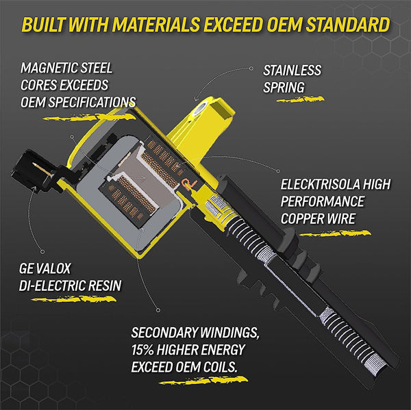Direct plug-in replacement for the OEM coil, Features grade silicone magnetic steel , and German copper wire and high temperature epoxy. The internal winding design is optimized for higher durability, The advanced bobbin technology increased the durability, all coil products were validated with most strict performance and environmental test, resists shock and vibration. Secondary contacts are made of brass, maximum the energy transfer to spark plug.