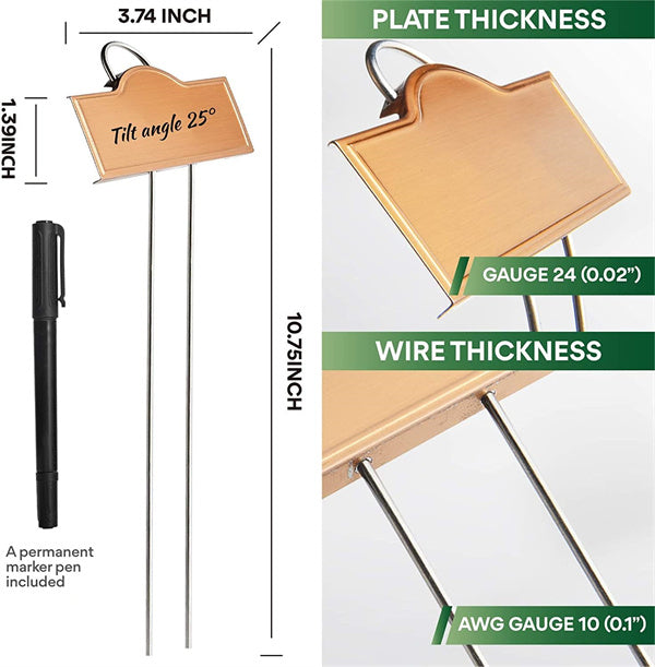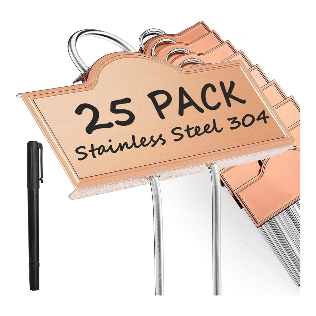25-Pack Metal Plant Markers: Made of stainless steel 304 with titanium-coated rose Gold last for decades. Weatherproof, Rustproof, and Corrosion resistant, and the color will never fade, while carbon steel with coating can only last months.