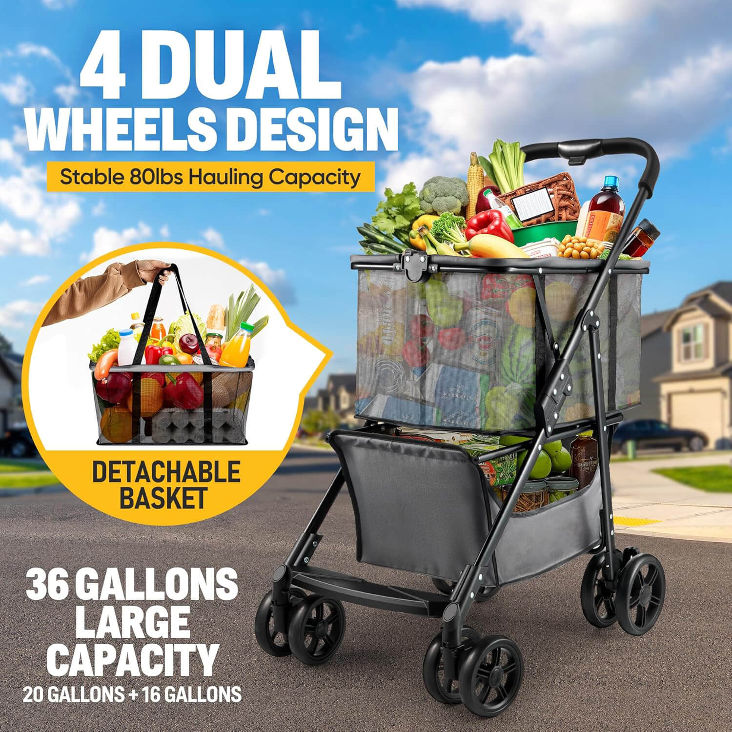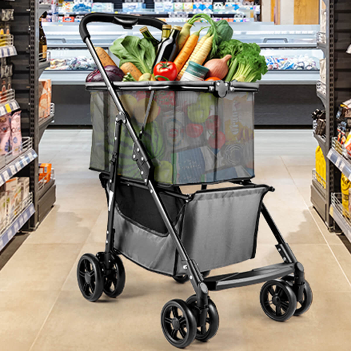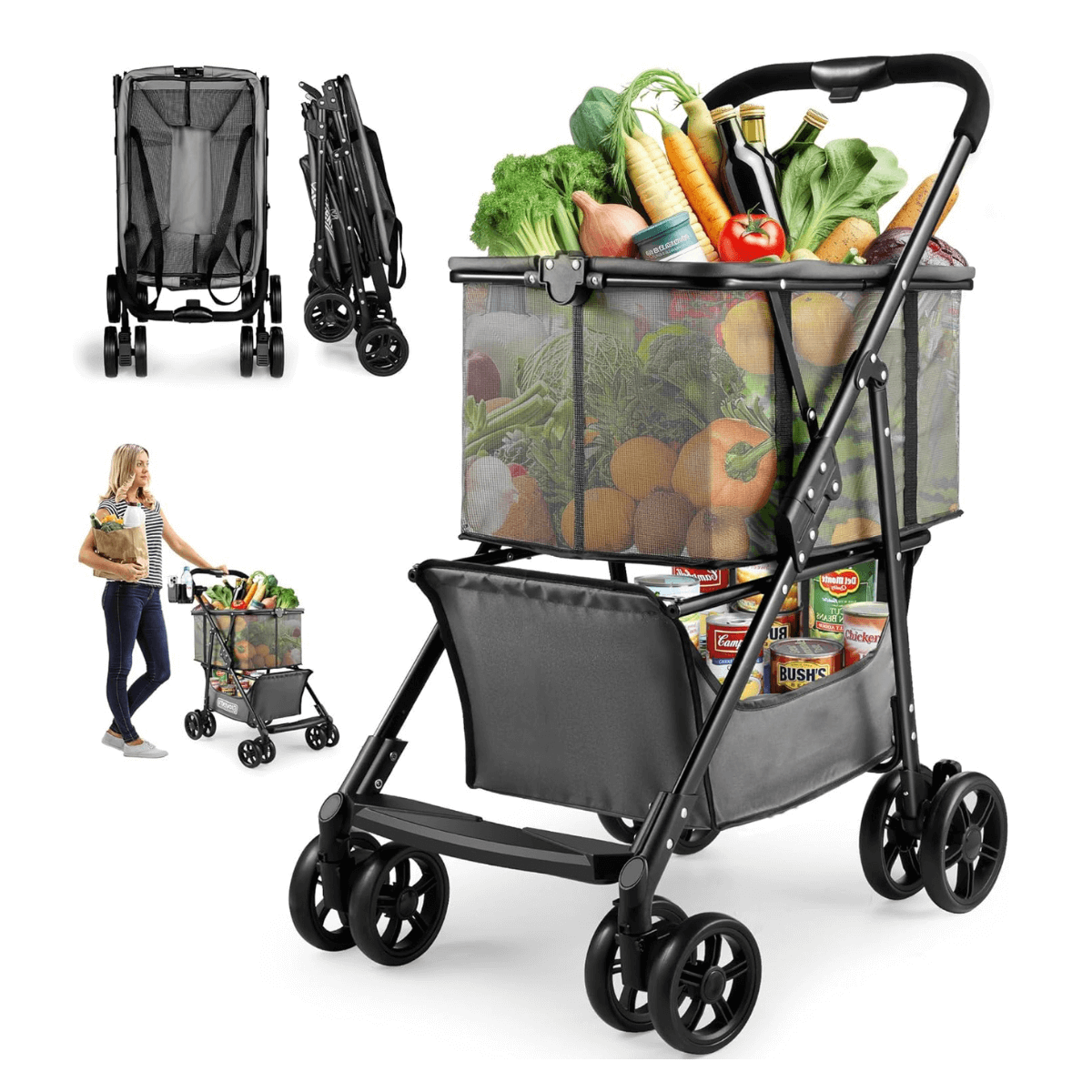 Folding Shopping Cart with Wheels, 80lbs Multi-Use Grocery Carts with 360° Wheels & Removable Tote Bag, Multifunctional Portable Personal Shopping Carts for Groceries